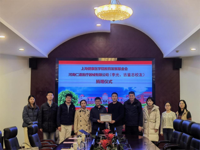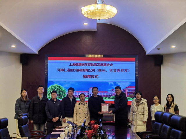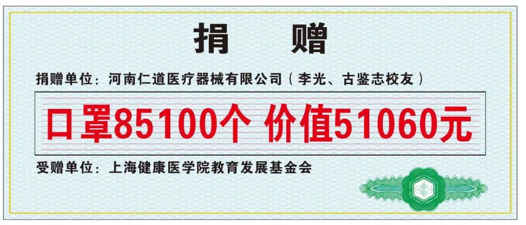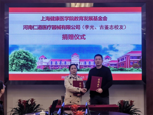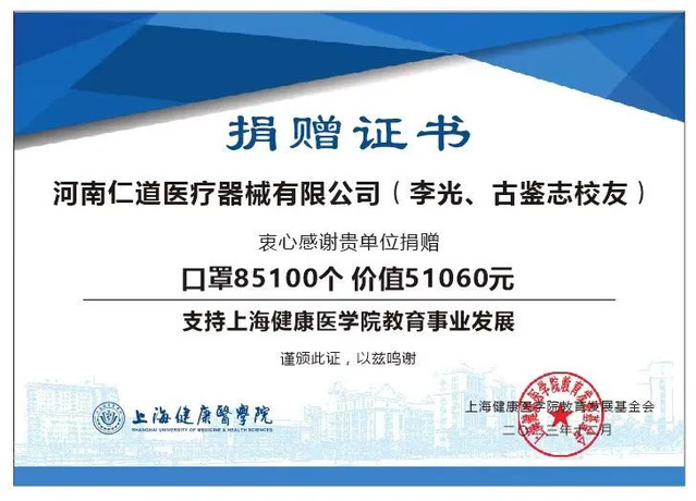 在全体人员的见证下,王红与古鉴志分别代表上海健康医学院教育发展基金会与河南仁道医疗有限公司签署捐赠协议、与会老师为校友颁发捐赠证书和感谢信。会后进行了口罩发放工作。