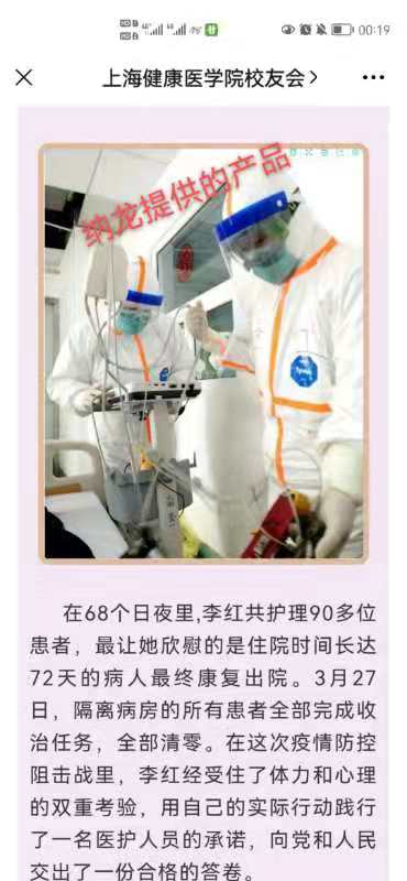 荣获2020年全国抗击新冠肺炎疫情先进个人84级校友李红在武汉市金银潭医院隔离病房操作的医疗设备就是校友企业纳龙科技捐赠的。