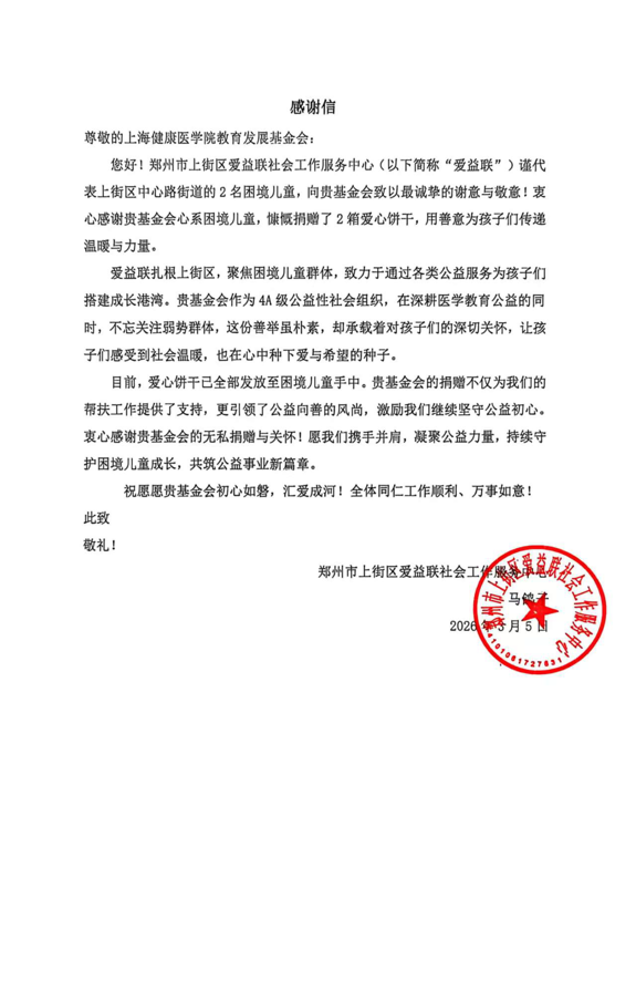 近日,上海健康医学院教育发展基金会收到了来自郑州市上街区爱益联社会工作服务中心的感谢信。据信反馈,基金会捐赠的2箱爱心饼干已全部发放至上街区中心路街道的2户困境儿童手中,为孩子们传递了温暖与力量。